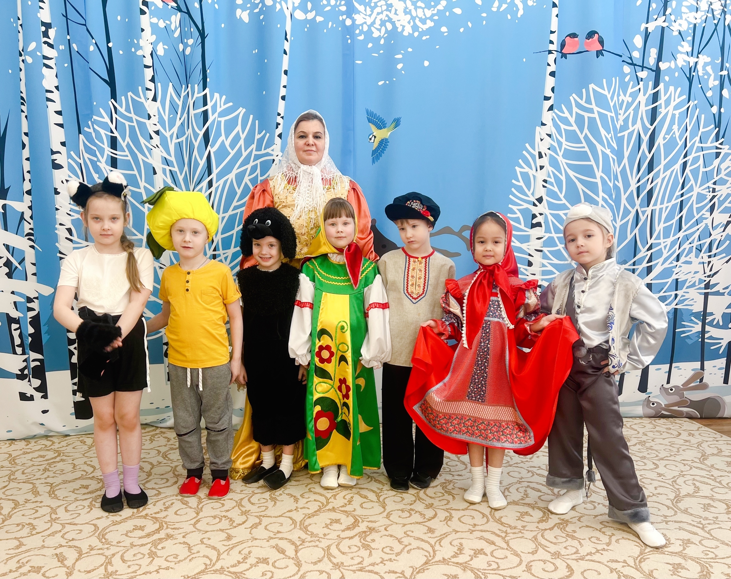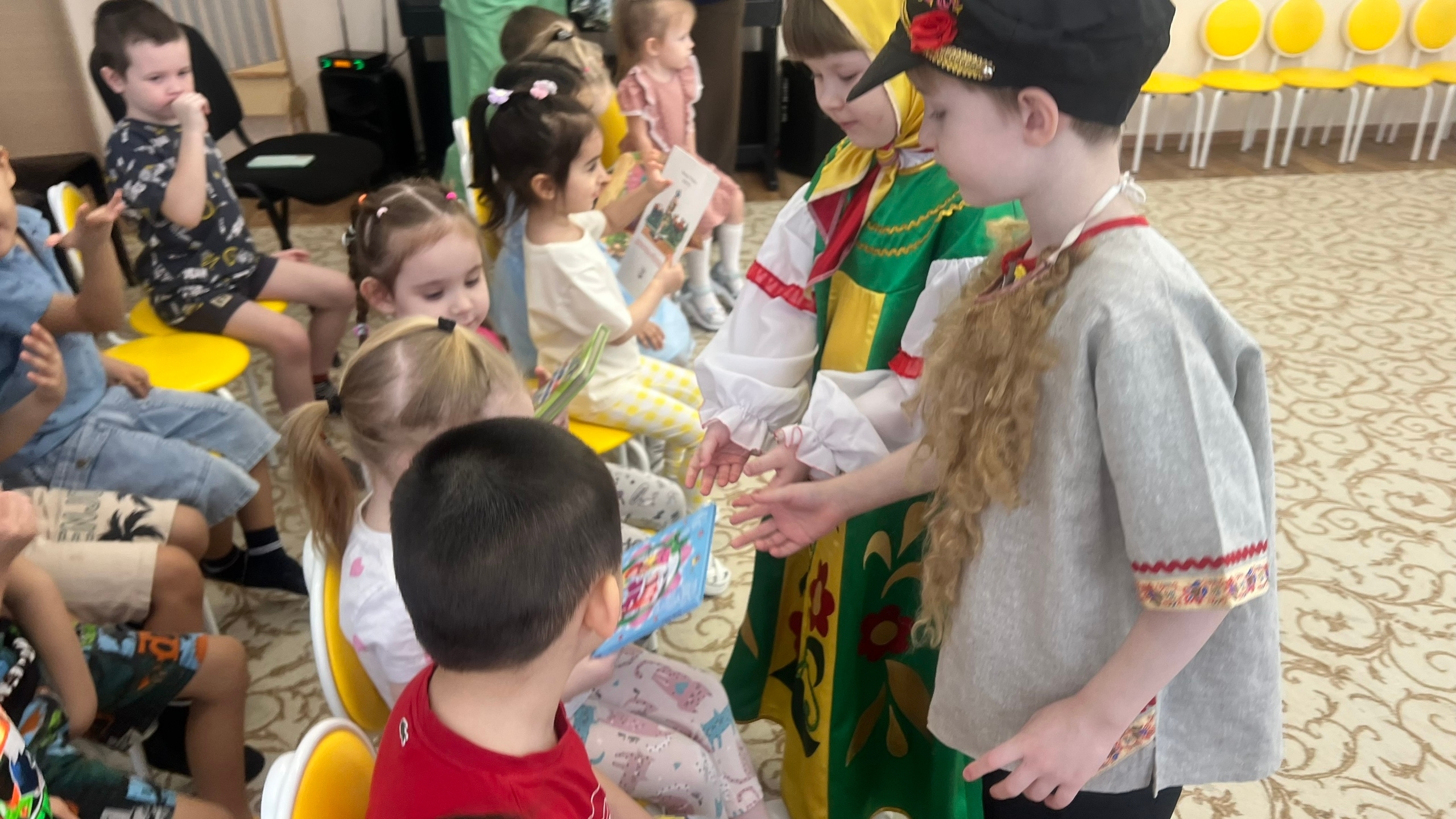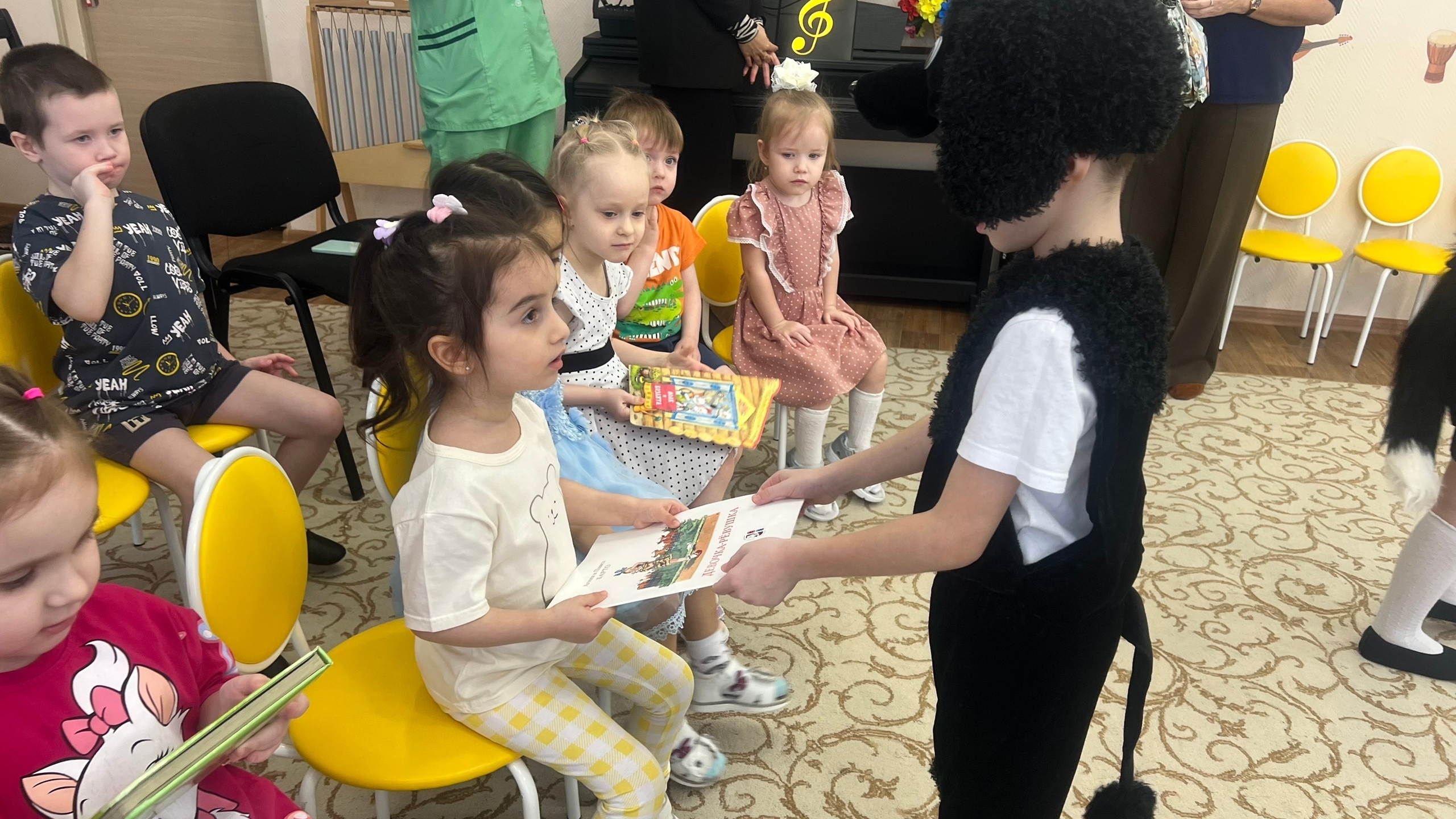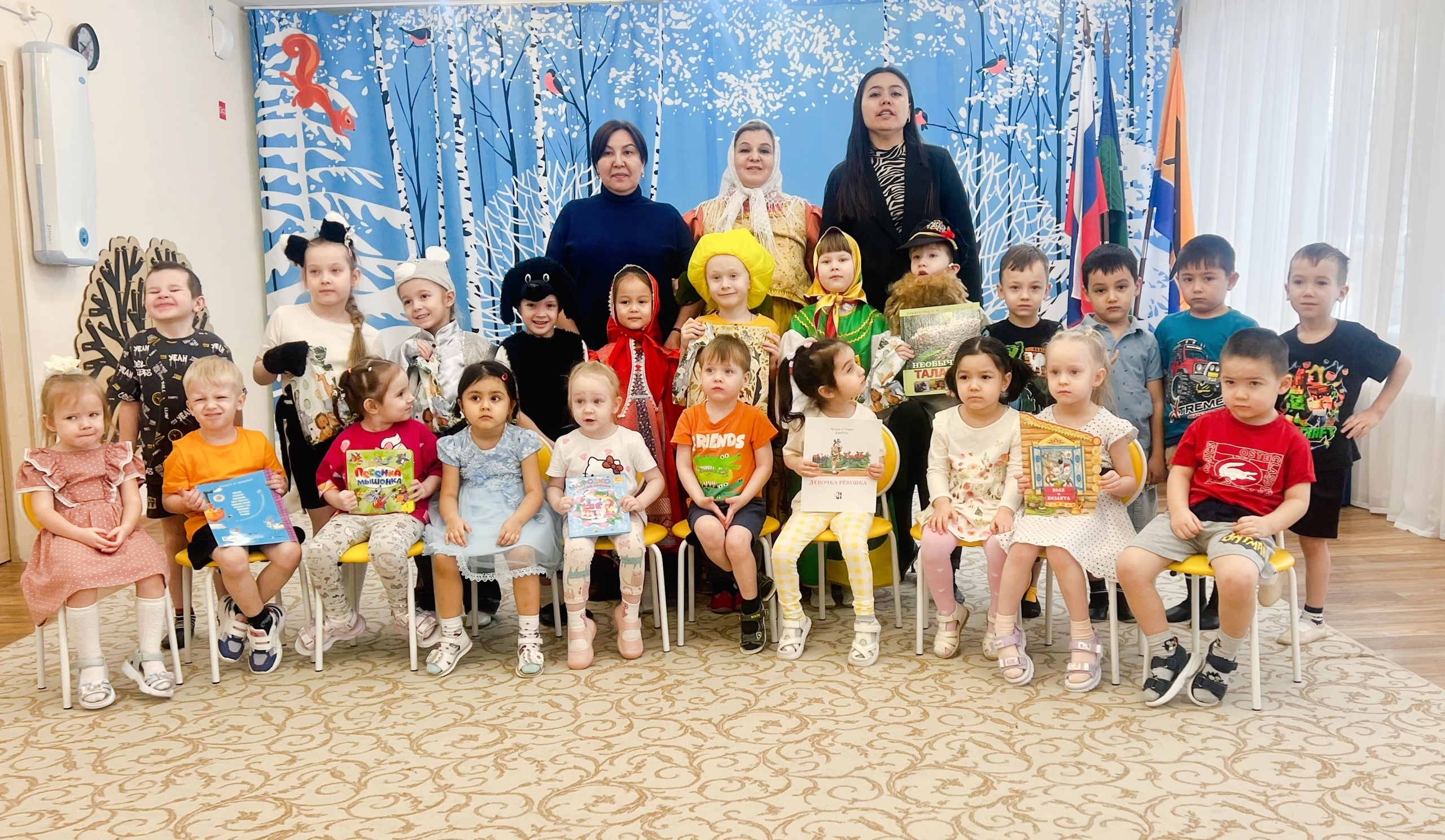 Накануне праздника, воспитанники группы "Гномики" подготовили театральную постановку и показали юным зрителям групп "Колокольчик" и "Пчёлка" русскую народную сказку "Репка", а те, в свою очередь, поблагодарили артистов бурными аплодисментами и подарками - вручили книги